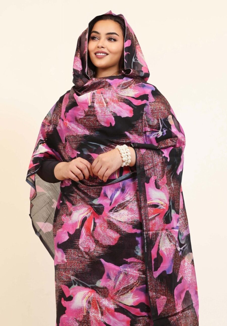 Black/Pink Floral Half Width Foil Voile. Width1.20 Cm, Weight 0.500 Grams, Hand Wash.